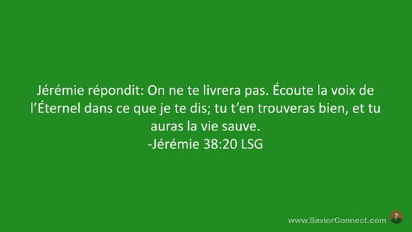 Jérémie répondit: On ne te livrera pas. Écoute la voix de l'Éternel dans ce que je te dis; tu t'en trouveras bien, et tu auras la vie sauve. -Jérémie 38:20 LSG