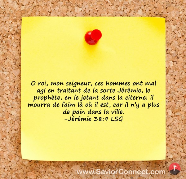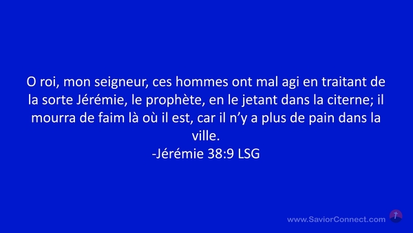 O roi, mon seigneur, ces hommes ont mal agi en traitant de la sorte Jérémie, le prophète, en le jetant dans la citerne; il mourra de faim là où il est, car il n'y a plus de pain dans la ville. -Jérémie 38:9 LSG