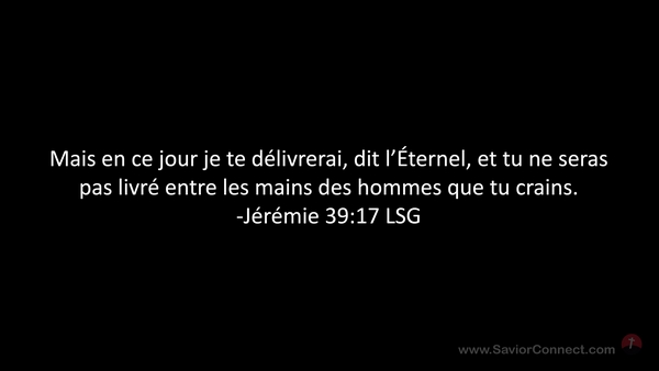Mais en ce jour je te délivrerai, dit l'Éternel, et tu ne seras pas livré entre les mains des hommes que tu crains. -Jérémie 39:17 LSG