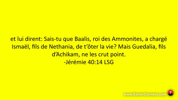 et lui dirent: Sais-tu que Baalis, roi des Ammonites, a chargé Ismaël, fils de Nethania, de t'ôter la vie? Mais Guedalia, fils d'Achikam, ne les crut point. -Jérémie 40:14 LSG