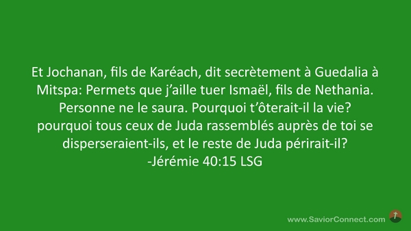 Et Jochanan, fils de Karéach, dit secrètement à Guedalia à Mitspa: Permets que j'aille tuer Ismaël, fils de Nethania. Personne ne le saura. Pourquoi t'ôterait-il la vie? pourquoi tous ceux de Juda rassemblés auprès de toi se disperseraient-ils, et le reste de Juda périrait-il? -Jérémie 40:15 LSG