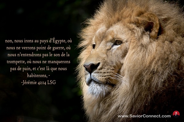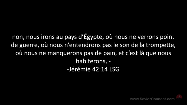 non, nous irons au pays d'Égypte, où nous ne verrons point de guerre, où nous n'entendrons pas le son de la trompette, où nous ne manquerons pas de pain, et c'est là que nous habiterons, - -Jérémie 42:14 LSG