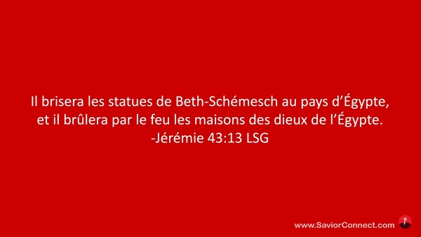 Il brisera les statues de Beth-Schémesch au pays d'Égypte, et il brûlera par le feu les maisons des dieux de l'Égypte. -Jérémie 43:13 LSG