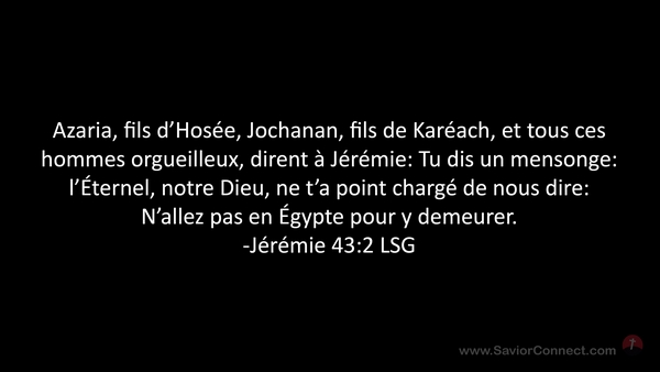 Azaria, fils d'Hosée, Jochanan, fils de Karéach, et tous ces hommes orgueilleux, dirent à Jérémie: Tu dis un mensonge: l'Éternel, notre Dieu, ne t'a point chargé de nous dire: N'allez pas en Égypte pour y demeurer. -Jérémie 43:2 LSG
