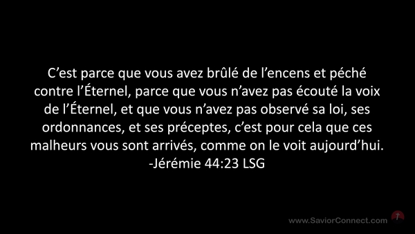 C'est parce que vous avez brûlé de l'encens et péché contre l'Éternel, parce que vous n'avez pas écouté la voix de l'Éternel, et que vous n'avez pas observé sa loi, ses ordonnances, et ses préceptes, c'est pour cela que ces malheurs vous sont arrivés, comme on le voit aujourd'hui. -Jérémie 44:23 LSG