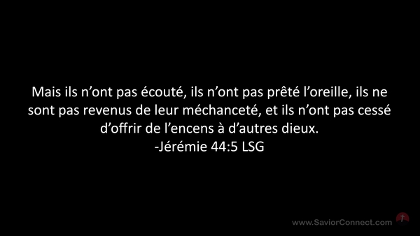Mais ils n'ont pas écouté, ils n'ont pas prêté l'oreille, ils ne sont pas revenus de leur méchanceté, et ils n'ont pas cessé d'offrir de l'encens à d'autres dieux. -Jérémie 44:5 LSG