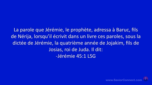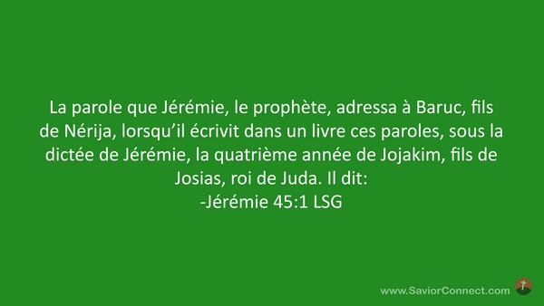La parole que Jérémie, le prophète, adressa à Baruc, fils de Nérija, lorsqu'il écrivit dans un livre ces paroles, sous la dictée de Jérémie, la quatrième année de Jojakim, fils de Josias, roi de Juda. Il dit: -Jérémie 45:1 LSG