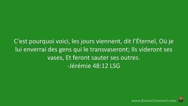 C'est pourquoi voici, les jours viennent, dit l'Éternel, Où je lui enverrai des gens qui le transvaseront; Ils videront ses vases, Et feront sauter ses outres. -Jérémie 48:12 LSG
