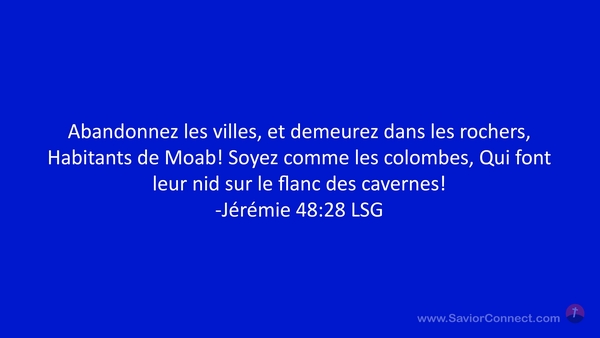 Abandonnez les villes, et demeurez dans les rochers, Habitants de Moab! Soyez comme les colombes, Qui font leur nid sur le flanc des cavernes! -Jérémie 48:28 LSG