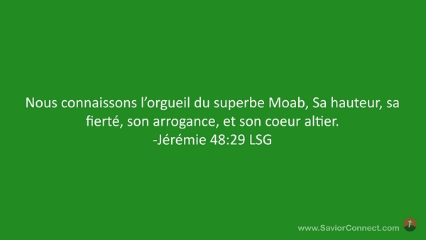 Nous connaissons l'orgueil du superbe Moab, Sa hauteur, sa fierté, son arrogance, et son coeur altier. -Jérémie 48:29 LSG