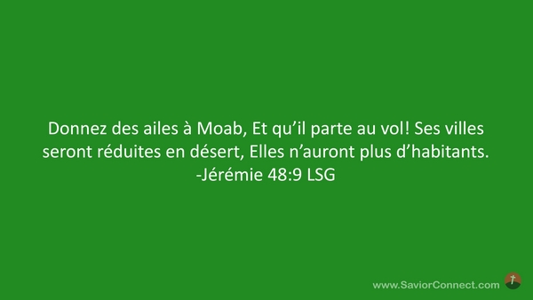 Donnez des ailes à Moab, Et qu'il parte au vol! Ses villes seront réduites en désert, Elles n'auront plus d'habitants. -Jérémie 48:9 LSG