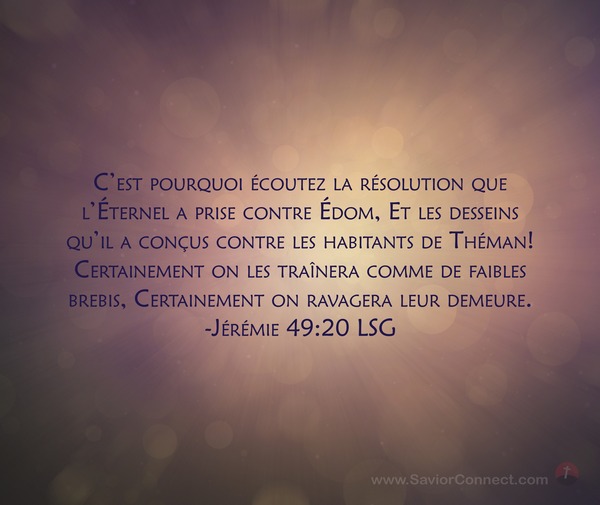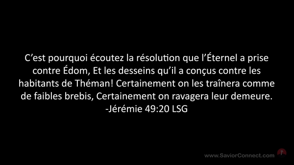 C'est pourquoi écoutez la résolution que l'Éternel a prise contre Édom, Et les desseins qu'il a conçus contre les habitants de Théman! Certainement on les traînera comme de faibles brebis, Certainement on ravagera leur demeure. -Jérémie 49:20 LSG