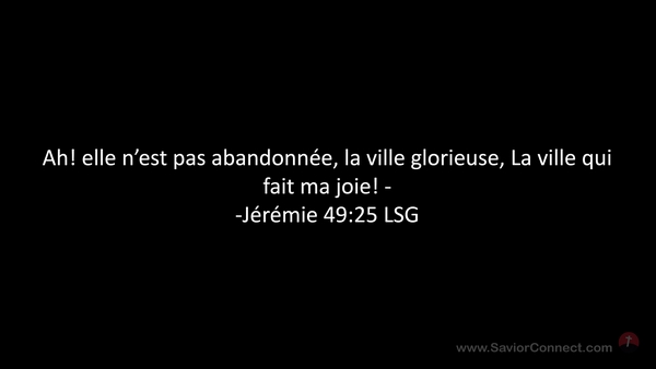 Ah! elle n'est pas abandonnée, la ville glorieuse, La ville qui fait ma joie! - -Jérémie 49:25 LSG
