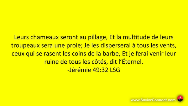 Leurs chameaux seront au pillage, Et la multitude de leurs troupeaux sera une proie; Je les disperserai à tous les vents, ceux qui se rasent les coins de la barbe, Et je ferai venir leur ruine de tous les côtés, dit l'Éternel. -Jérémie 49:32 LSG