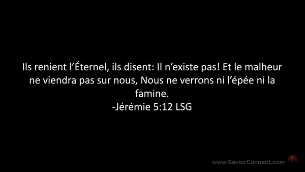 Ils renient l'Éternel, ils disent: Il n'existe pas! Et le malheur ne viendra pas sur nous, Nous ne verrons ni l'épée ni la famine. -Jérémie 5:12 LSG