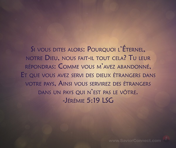 Si vous dites alors: Pourquoi l'Éternel, notre Dieu, nous fait-il tout cela? Tu leur répondras: Comme vous m'avez abandonné, Et que vous avez servi des dieux étrangers dans votre pays, Ainsi vous servirez des étrangers dans un pays qui n'est pas le vôtre. -Jérémie 5:19 LSG