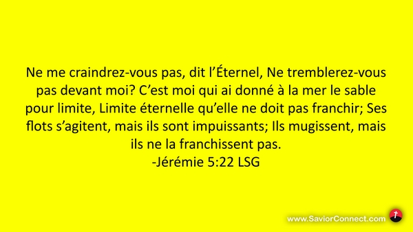 Ne me craindrez-vous pas, dit l'Éternel, Ne tremblerez-vous pas devant moi? C'est moi qui ai donné à la mer le sable pour limite, Limite éternelle qu'elle ne doit pas franchir; Ses flots s'agitent, mais ils sont impuissants; Ils mugissent, mais ils ne la franchissent pas. -Jérémie 5:22 LSG