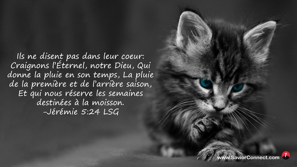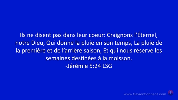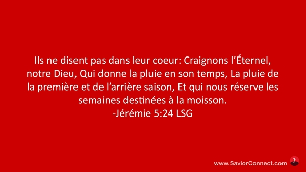Ils ne disent pas dans leur coeur: Craignons l'Éternel, notre Dieu, Qui donne la pluie en son temps, La pluie de la première et de l'arrière saison, Et qui nous réserve les semaines destinées à la moisson. -Jérémie 5:24 LSG