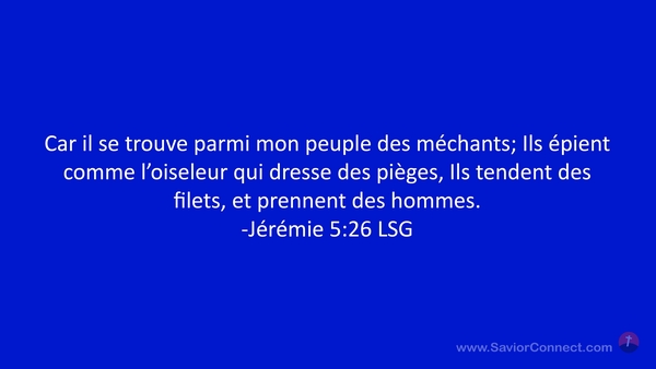 Car il se trouve parmi mon peuple des méchants; Ils épient comme l'oiseleur qui dresse des pièges, Ils tendent des filets, et prennent des hommes. -Jérémie 5:26 LSG