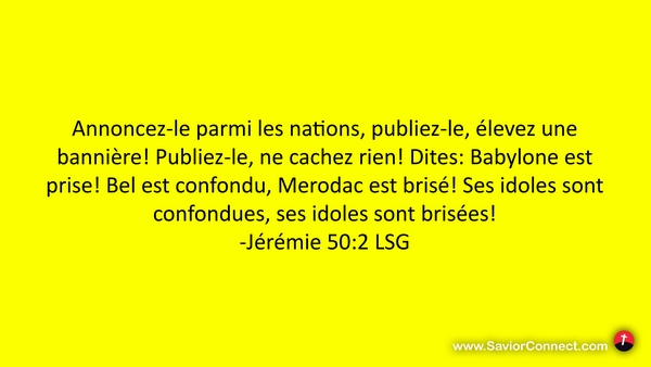 Annoncez-le parmi les nations, publiez-le, élevez une bannière! Publiez-le, ne cachez rien! Dites: Babylone est prise! Bel est confondu, Merodac est brisé! Ses idoles sont confondues, ses idoles sont brisées! -Jérémie 50:2 LSG