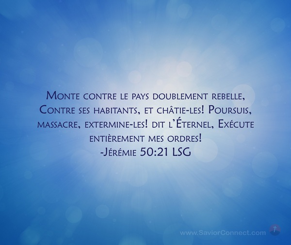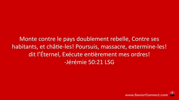 Monte contre le pays doublement rebelle, Contre ses habitants, et châtie-les! Poursuis, massacre, extermine-les! dit l'Éternel, Exécute entièrement mes ordres! -Jérémie 50:21 LSG