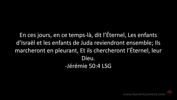 En ces jours, en ce temps-là, dit l'Éternel, Les enfants d'Israël et les enfants de Juda reviendront ensemble; Ils marcheront en pleurant, Et ils chercheront l'Éternel, leur Dieu. -Jérémie 50:4 LSG