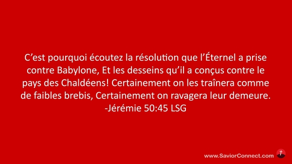 C'est pourquoi écoutez la résolution que l'Éternel a prise contre Babylone, Et les desseins qu'il a conçus contre le pays des Chaldéens! Certainement on les traînera comme de faibles brebis, Certainement on ravagera leur demeure. -Jérémie 50:45 LSG