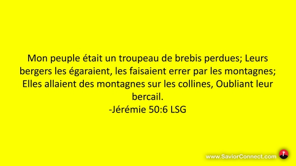Mon peuple était un troupeau de brebis perdues; Leurs bergers les égaraient, les faisaient errer par les montagnes; Elles allaient des montagnes sur les collines, Oubliant leur bercail. -Jérémie 50:6 LSG