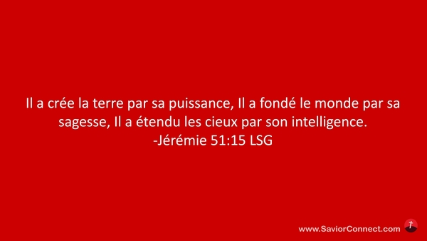 Il a crée la terre par sa puissance, Il a fondé le monde par sa sagesse, Il a étendu les cieux par son intelligence. -Jérémie 51:15 LSG