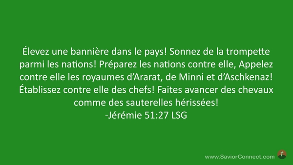 Élevez une bannière dans le pays! Sonnez de la trompette parmi les nations! Préparez les nations contre elle, Appelez contre elle les royaumes d'Ararat, de Minni et d'Aschkenaz! Établissez contre elle des chefs! Faites avancer des chevaux comme des sauterelles hérissées! -Jérémie 51:27 LSG