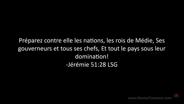 Préparez contre elle les nations, les rois de Médie, Ses gouverneurs et tous ses chefs, Et tout le pays sous leur domination! -Jérémie 51:28 LSG