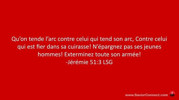Qu'on tende l'arc contre celui qui tend son arc, Contre celui qui est fier dans sa cuirasse! N'épargnez pas ses jeunes hommes! Exterminez toute son armée! -Jérémie 51:3 LSG