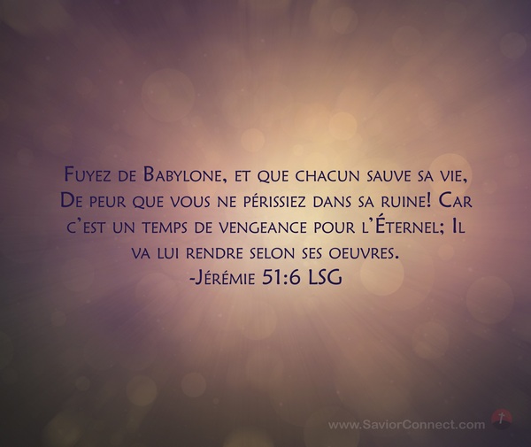Fuyez de Babylone, et que chacun sauve sa vie, De peur que vous ne périssiez dans sa ruine! Car c'est un temps de vengeance pour l'Éternel; Il va lui rendre selon ses oeuvres. -Jérémie 51:6 LSG