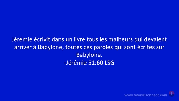 Jérémie écrivit dans un livre tous les malheurs qui devaient arriver à Babylone, toutes ces paroles qui sont écrites sur Babylone. -Jérémie 51:60 LSG
