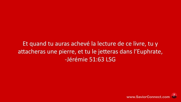 Et quand tu auras achevé la lecture de ce livre, tu y attacheras une pierre, et tu le jetteras dans l'Euphrate, -Jérémie 51:63 LSG