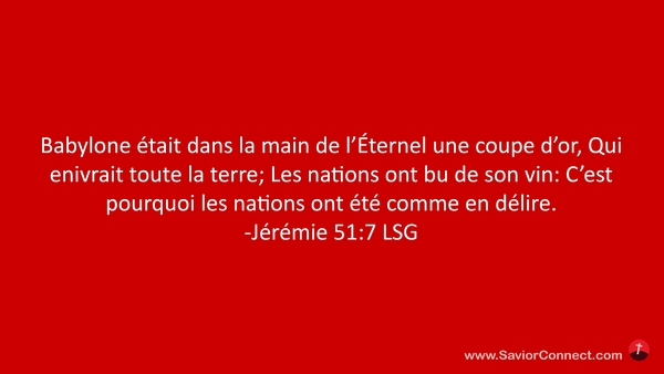 Babylone était dans la main de l'Éternel une coupe d'or, Qui enivrait toute la terre; Les nations ont bu de son vin: C'est pourquoi les nations ont été comme en délire. -Jérémie 51:7 LSG