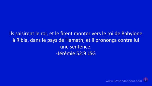Ils saisirent le roi, et le firent monter vers le roi de Babylone à Ribla, dans le pays de Hamath; et il prononça contre lui une sentence. -Jérémie 52:9 LSG