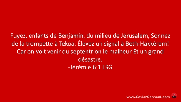 Fuyez, enfants de Benjamin, du milieu de Jérusalem, Sonnez de la trompette à Tekoa, Élevez un signal à Beth-Hakkérem! Car on voit venir du septentrion le malheur Et un grand désastre. -Jérémie 6:1 LSG