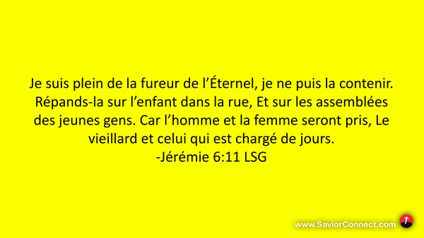 Je suis plein de la fureur de l'Éternel, je ne puis la contenir. Répands-la sur l'enfant dans la rue, Et sur les assemblées des jeunes gens. Car l'homme et la femme seront pris, Le vieillard et celui qui est chargé de jours. -Jérémie 6:11 LSG