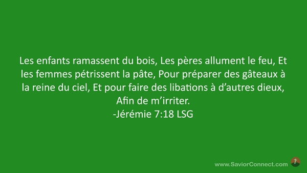 Les enfants ramassent du bois, Les pères allument le feu, Et les femmes pétrissent la pâte, Pour préparer des gâteaux à la reine du ciel, Et pour faire des libations à d'autres dieux, Afin de m'irriter. -Jérémie 7:18 LSG