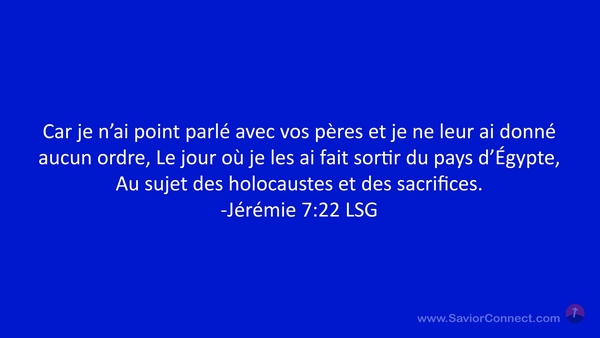 Car je n'ai point parlé avec vos pères et je ne leur ai donné aucun ordre, Le jour où je les ai fait sortir du pays d'Égypte, Au sujet des holocaustes et des sacrifices. -Jérémie 7:22 LSG