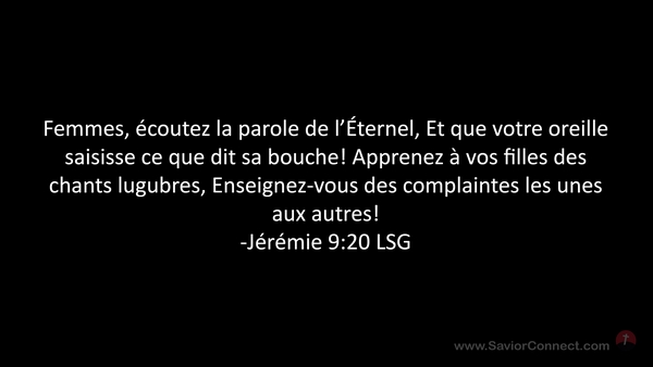 Femmes, écoutez la parole de l'Éternel, Et que votre oreille saisisse ce que dit sa bouche! Apprenez à vos filles des chants lugubres, Enseignez-vous des complaintes les unes aux autres! -Jérémie 9:20 LSG