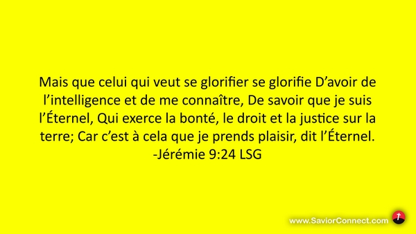 Mais que celui qui veut se glorifier se glorifie D'avoir de l'intelligence et de me connaître, De savoir que je suis l'Éternel, Qui exerce la bonté, le droit et la justice sur la terre; Car c'est à cela que je prends plaisir, dit l'Éternel. -Jérémie 9:24 LSG