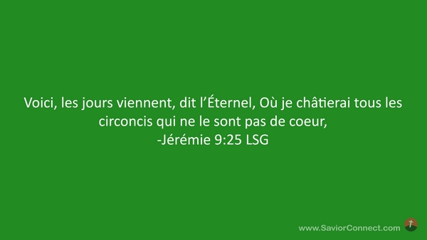 Voici, les jours viennent, dit l'Éternel, Où je châtierai tous les circoncis qui ne le sont pas de coeur, -Jérémie 9:25 LSG