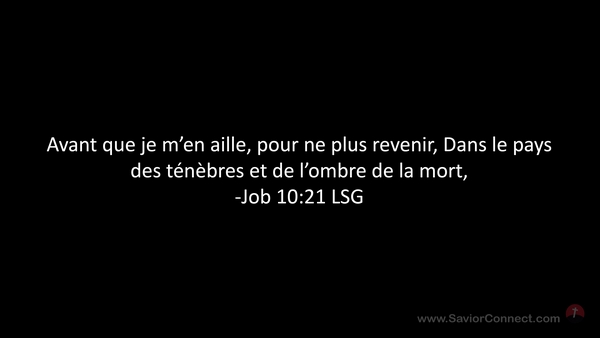 Avant que je m'en aille, pour ne plus revenir, Dans le pays des ténèbres et de l'ombre de la mort, -Job 10:21 LSG