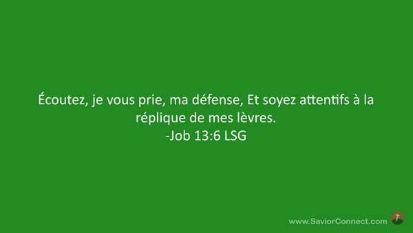 Écoutez, je vous prie, ma défense, Et soyez attentifs à la réplique de mes lèvres. -Job 13:6 LSG