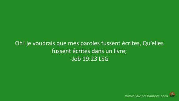 Oh! je voudrais que mes paroles fussent écrites, Qu'elles fussent écrites dans un livre; -Job 19:23 LSG