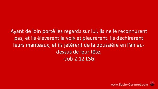 Ayant de loin porté les regards sur lui, ils ne le reconnurent pas, et ils élevèrent la voix et pleurèrent. Ils déchirèrent leurs manteaux, et ils jetèrent de la poussière en l'air au-dessus de leur tête. -Job 2:12 LSG