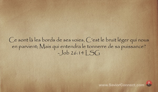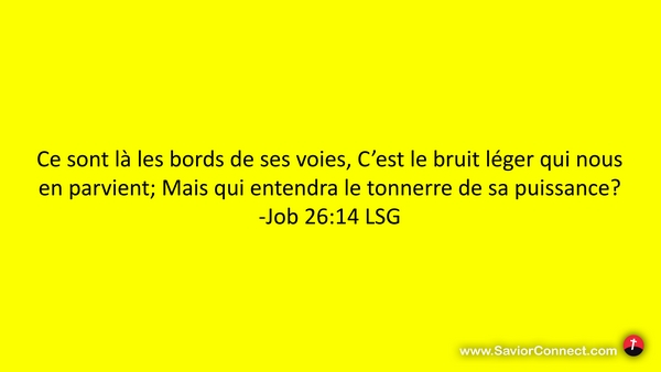 Ce sont là les bords de ses voies, C'est le bruit léger qui nous en parvient; Mais qui entendra le tonnerre de sa puissance? -Job 26:14 LSG