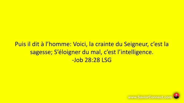 Puis il dit à l'homme: Voici, la crainte du Seigneur, c'est la sagesse; S'éloigner du mal, c'est l'intelligence. -Job 28:28 LSG